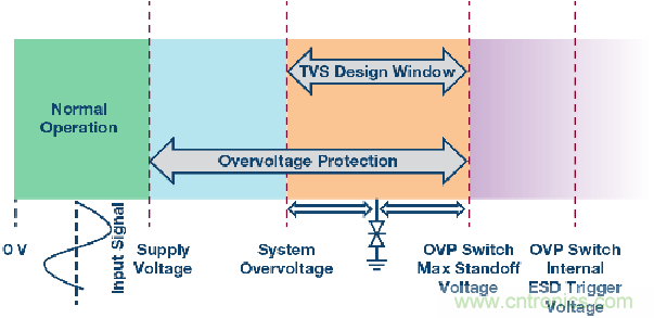 圖3顯示了一個(gè)與外部接口的系統(tǒng)輸入端的工作區(qū)域。最左邊的區(qū)域(綠色)表示正常工作區(qū)間,輸入電壓位于電源電壓范圍以內(nèi)。左起第二個(gè)區(qū)域(藍(lán)色)表示輸入端可能存在持續(xù)直流或長時(shí)間交流過壓的范圍,原因是斷電、接線錯(cuò)誤或短路。另外,圖中最右側(cè)(紫色)是過壓開關(guān)內(nèi)部ESD保護(hù)二極管的觸發(fā)電壓。選擇的TVS擊穿電壓(橙色)必須小于過壓保護(hù)開關(guān)的最大承受電壓并且大于任何已知的可能持續(xù)直流或長時(shí)間交流過壓,以免無意中觸發(fā)TVS。