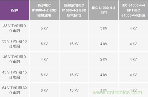 表1. 測(cè)試結(jié)果(未在0 Ω電阻與33 V TVS及45 V TVS組合條件下進(jìn)行IEC空氣放電測(cè)試)