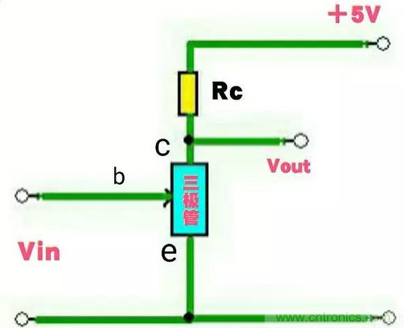 這里假定圖中的三極管是一個NPN型三極管,其c-e兩極之間的電阻可以視為一個受輸入信號控制的壓控電阻。Vin為加在三極管be結(發射結)的輸入信號電壓,Vout為三極管集電極的輸出電壓。