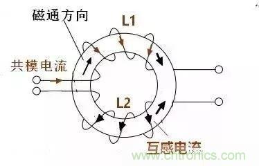 顯然,流過L1的共模電流和流過L2的共模電流產(chǎn)生磁通相互疊加,總磁通增加。L1和L2除了自感以外還有互感,L1的電感量除了本身的電感外還要加上L2的互感,反之L2也一樣。
