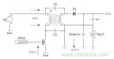 共模干擾由MOS管的高di/dt引起,經(jīng)過變壓器間的電容Cp或雜散電容C2傳到副邊,以Cp為主,C2基本可忽略。我們知道Cp很小,因此能傳到副邊的干擾頻率一定很高,低頻干擾信號(hào)過不去,因此EMI測試中的高頻部分基本就是共模干擾。究竟多少M(fèi)Hz與變壓器的結(jié)構(gòu)有很大的關(guān)系,層間電容大了則可能1MHz的共模能過去,層間電容小了,則只能是更高的頻率能過去,比如5MHz以上。
