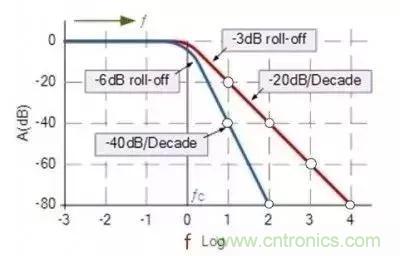 圖中橫坐標(biāo)是頻率,用對(duì)數(shù)表示,縱坐標(biāo)表示增益,單位為dB,注意圖中的圓點(diǎn)處,右面一條是一階濾波器的衰減曲線,圓點(diǎn)從1 到 2 頻率增加了十倍,從縱坐標(biāo)中可以看到增益下降了20dB,通常稱為10倍頻程衰減20dB,左面一條曲線是二階濾波器,不難看出10倍頻程衰減40dB。