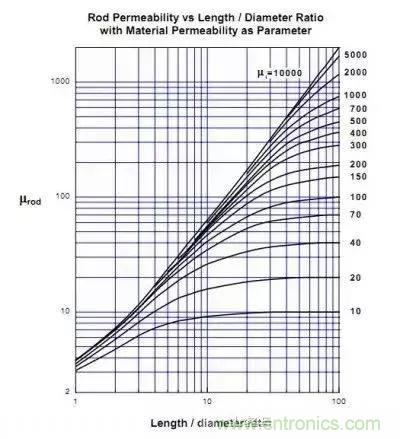 圖中橫坐標(biāo)是磁棒的長度與直徑之比,隨長度變短氣隙變小等效磁導(dǎo)率也變小,這好像不合理,我們看磁環(huán)的電感計(jì)算公式:
