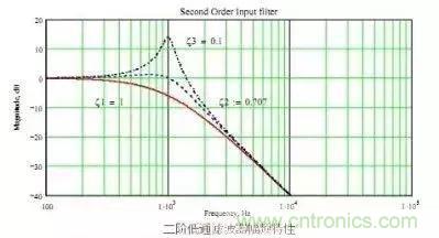 有于濾波電路中有兩個(gè)儲(chǔ)能原件因此是兩階濾波器,這濾波器有個(gè)很大的問題,由于無阻尼,因此當(dāng)干擾信號(hào)的頻率達(dá)到濾波器的截止頻率時(shí)(Cut off),干擾信號(hào)不但沒有被抑制反而被放大了,如圖所示: