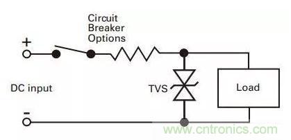 在實際的電路中,如圖2所示,在DC input的時候,有時由于供電環(huán)境的變化會帶來一些瞬時脈沖。而要消除瞬時脈沖對器件損害的最好辦法,就是將瞬時電流從敏感器件引到地,一般具體做法是將TVS在線路板上與被保護(hù)線路并聯(lián)。這樣,當(dāng)瞬時電壓超過電路正常工作電壓后,TVS將發(fā)生雪崩擊穿,從而提供給瞬時電流一個超低阻抗的通路,其結(jié)果是瞬時電流通過TVS被短路到GND,從而避開被保護(hù)器件,并且在電壓恢復(fù)正常值之前使被保護(hù)回路一直保持截止電壓。而當(dāng)瞬時脈沖結(jié)束以后,TVS二極管再自動恢復(fù)至高阻狀態(tài),整個回路又回到正常電壓狀態(tài)。