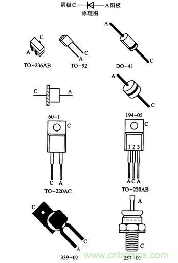 其它不同的封裝用不同的圖形表示。以辨認引腳,有少數幾種印上肖特基二極管符號。雖然看不見標記,但是圖8-24的194-05封裝用了這種方法。TO-220AC封裝有兩個陰極引腳,其中金屬片使兩個陽極連通。引腳和金屬片都可以用作肖特基二極管和電路連接端。而TO-220AB有兩個陽極引腳。由于它內部有二個肖特基二極管,陽極有不同的端,但是內部兩個陰極是連接在一起的。