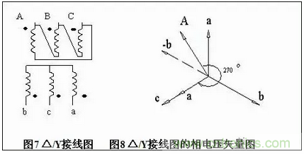 如圖7所示,識(shí)別圖中△/Y的接線圖它屬于幾組,根據(jù)上面的方法,畫出次邊a、b、c三相相電壓矢量圖,從接線圖中可以看出原邊A相繞組的頭連接B相繞組的尾作為原邊A相引出線,因此我們把原邊相電壓矢量A畫到次邊矢量a和-b中間,而次邊C相繞組的頭作為次邊a相輸出,因此我們把次邊矢量C當(dāng)成是矢量a調(diào)相來使用,然后以原邊A相順時(shí)旋轉(zhuǎn)到次邊a相,它們的夾角為270°,因此這個(gè)接線圖為 △/Y-9聯(lián)接組,見圖8。