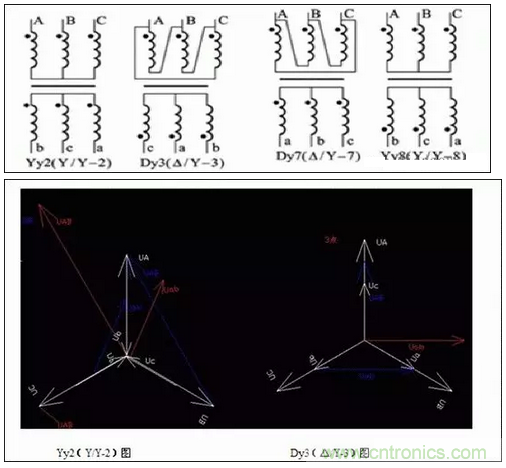 常見變壓器高壓側(cè)有三角形和星型接法,低壓側(cè)也有三角形或星型接法;這幾種接法相組合,加上高壓側(cè)和低壓側(cè)電壓形成一定的角度差;再加上高低壓側(cè)中性點(diǎn)有接地和不接地兩種方式,這就構(gòu)成了變壓器連接組別的所有要素。