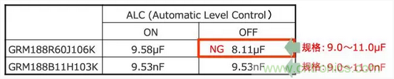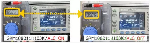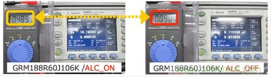 大容量和非大容量MLCC在ALC (Automatic Level Control )ON/OFF的狀態下測定靜電容量。結果如下。
