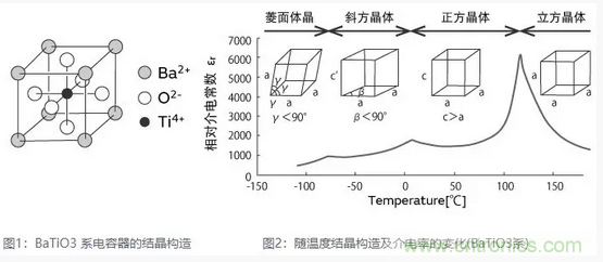 BaTiO3系陶瓷電容器加熱到居里點以上時,結晶構造由正方晶系轉變成立方晶系。冷卻到居里點溫度以下時,結晶構造由立方晶系轉變成正方晶系。(圖2)