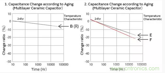 高誘電系的積層陶瓷電容器的靜電容量,以經過125℃以上的熱處理24小時后的值作為基準,與時間成對數關系直線性下降。請參考如下本公司制品靜電容量老化特性的代表例子。