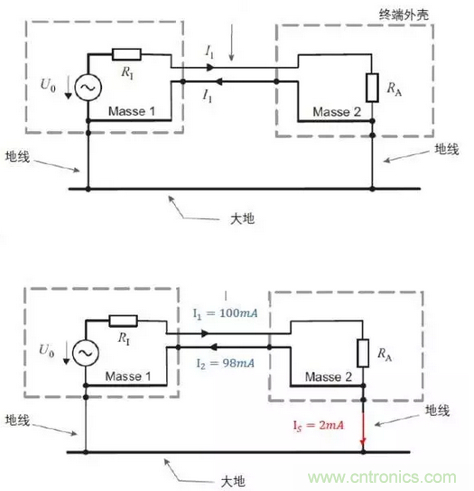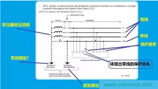 知曉這幾個概念后,我們來看看IEC給出的有關TN-C和TT系統的原圖。注意,這兩幅圖是不容置疑的,是有關接地系統的權威解釋。