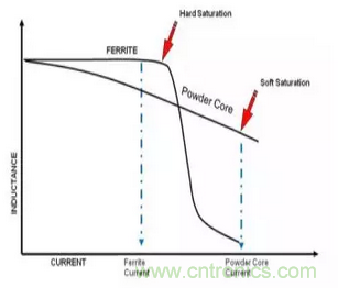 所以一般電感的電感值在0A電流的時候電感值最大,但是隨著電流增大電感值會慢慢下降,不同的磁芯材料,電感值的下降速度不一樣。當電感值下降很快的時候,我們稱這個電感為Soft Saturation, 當電感值開始下降很慢的時候,我們成為Stiff/Hard Saturation。不少電感值在飽和后,只有原電感值的1/3,甚至1/10。這點變化也是電路設計中需要重點考慮的。