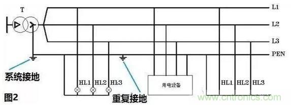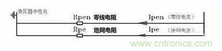 在這樣的供電系統(tǒng)中地線和零線合二為一稱之為PEN線,值得注意的是這種系統(tǒng)中的PEN線需要在配電網(wǎng)中重復接地形成一個接地網(wǎng),以保證PEN線的零電位。