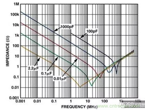 并聯不同電容值的電容器有助于確保電源引腳在很寬的頻帶上出現很低的交流(AC)阻抗。這對于在運算放大器電源抑制比(PSR)衰減頻率處尤其重要。該電容器有助于補償放大器降低的PSR。在許多十倍頻程范圍內保持低阻抗的接地通路將有助于確保有害的雜訊不能進入運算放大器。(圖一)顯示採用多個并聯電容器的優點。在低頻段,大的電容器提供低阻抗的接地通路。但是一旦頻率達到了它們自身的諧振頻率,電容器的相容性就會減弱,并且逐漸呈現出電感性。這就是為什么採用多個電容器是很重要的原因:當一個電容器的頻率回應開始下降時,另一個電容器的頻率回應開始其作用,所以能在許多十倍頻程范圍內保持很低的AC阻抗。