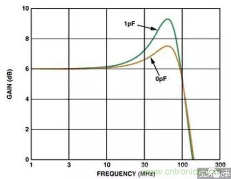 在高速電路中,很小的值就會影響電路的性能。有時候電容值幾十個pF的電容就足夠了。相關實例:如果在反相輸入端僅有1pF的附加寄生電容,它在頻率域可以引起差不多2dB的尖脈沖,如(圖四)。如果寄生電容足夠大的話,它會引起電路的不穩定和震盪。
