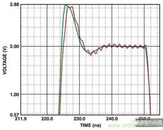 (圖七)中的震盪顯示高速運算放大器同相輸入端長度為2.54cm的印制線的影響。其等效寄生電感為29nH(10-9H),足以造成持續的低壓振蕩,會持續到整個瞬態回應周期。圖七還顯示了如何利用接地平面來減小寄生電感的影響。