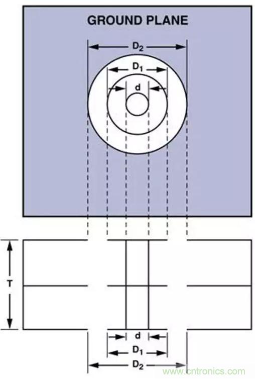 εr表示PCB材料的相對磁導率。T表示PCB的厚度。D1表示環繞通孔的焊盤直徑。D2表示接地平面中隔離孔的直徑。所有尺寸均以cm為單位。在一塊0.157 cm厚的PCB上一個通孔就可以增加1.2nH的寄生電感和0.5pF的寄生電容;這就是為什么在給PCB佈線時一定要時刻保持警覺的原因,要將寄生效應的影響降至最小。