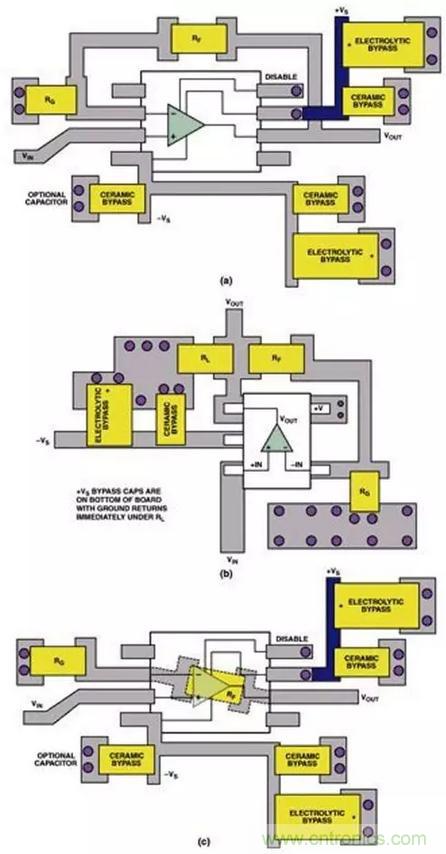 (圖九) 同一運算放大器電路的佈線區別:(a)SOIC封裝;(b)SOT-23封裝;(c)在PCB下面採用RF的SOIC封裝