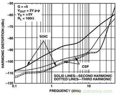 這種引腳排列還有一個好處就是降低了二次諧波失真。傳統運算放大器的引腳配置中引起二次諧波失真的一個原因是同相輸入和負電源引腳之間的耦合作用。LFCSP封裝的低失真引腳排列消除了這種耦合所以大大地降低了二次諧波失真;在有些情況下最多可降低14dB。(圖十二)顯示了採用SOIC封裝和LFCSP封裝失真性能的差別。