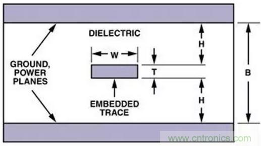 帶狀控制阻抗印制線(圖十四)採用了兩層接地平面,信號印制線夾在其中。這種方法使用了較多的印制線,需要的PCB層數更多,對電介質厚度變化敏感,而且成本更高,所以通常只用于要求嚴格的應用中。
