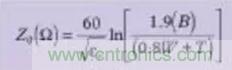 用于帶狀線的特征阻抗計算公式如(公式七)所示: