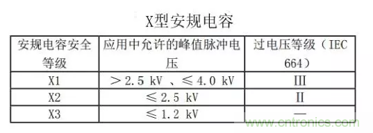 X型安規電容根據耐壓分為 X1、X2、X3三種,安規電容安全等級中允許的峰值脈沖電壓過電壓等級:2.5kV<X1≤4.0kV、X2≤2.5kV、X3≤1.2kV