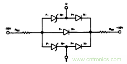 圖4舉例說明了通過在電源供電引腳串聯二極管(比如1N459)防止寄生晶體管導通的方法。如果S端或D端電壓高于電源電壓時,CR1和/或CR2反向偏置,基極驅動電路不能使晶體管導通。每個CMOS器件都應該有一對獨立的二極管對其進行保護。盡管這個方法很有效,但它不是萬無一失的。如果開關的一端連接到一個負電位(例如一個充電電容),并且另一端電壓超過VDD,則盡管有保護二極管。