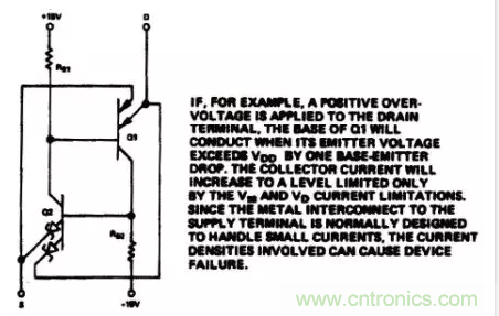 圖1是一個典型CMOS輸出開關單元的電路圖及截面圖。從不同單元和區域之間的連接關系中,我們可以畫出一個等效二極管電路圖(圖2)。如果在S端或D端的模擬輸人電壓超過電源電壓。