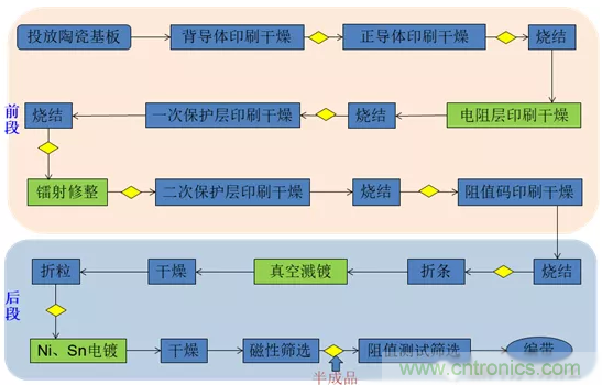 常規(guī)厚膜片式電阻的完整生產(chǎn)流程大致如下: