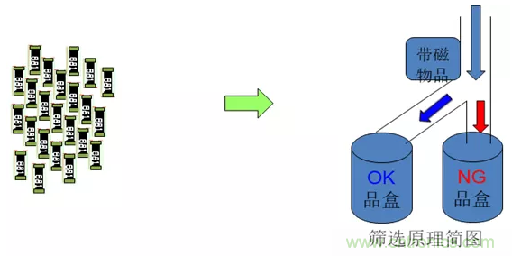【原理】不良品的磁性小,吸引力小,進(jìn)行篩選時會自動掉落到不良品盒,良品掉落到良品盒。