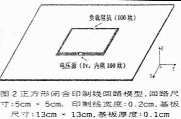 這是一種帶有接地平面的正方形的閉合印制線環(huán)路,在回路的兩端分別接有電壓源和阻抗相等的源內(nèi)阻、負載,當(dāng)電壓信號的頻率較高時,這種結(jié)構(gòu)與方環(huán)形天線是非常相似的,成為一種嚴(yán)重的輻射源。