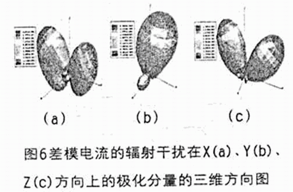閉合印制線回路上流過的差模電流產(chǎn)生的輻射干擾在各個極化方向上的分布是不同的。圖6是矩形印制線回路的源和終端所在的邊為3(回路面積為25)時頻率為1.5GHz差模電流的輻射干擾在X、Y、Z方向上的極化分量的三維方向圖,從圖中可以看到,X和Z方向上的極化分量主要集中于印制板正面的X軸的兩側(cè),而Y方向上的極化分量主要集中于印制板的正上方區(qū)域,并且沿Y方向的極化分量最大,分別為X、Y方向極化分量的兩倍左右,對于源和終端所在邊為2cm、4cm和5cm時的閉合回路也是如此。