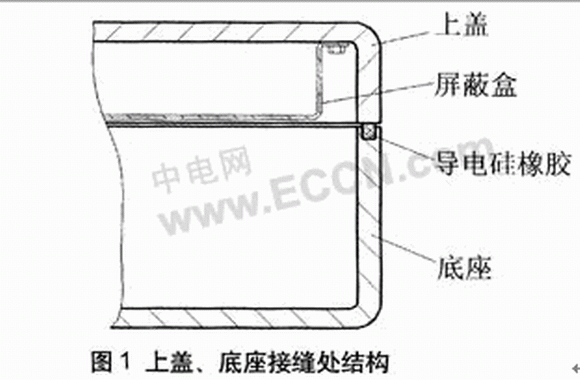 上蓋、底座接縫處的結(jié)構(gòu)采用圖1所示形式,這樣不僅可以提高屏蔽效能,還可以提供可靠的環(huán)境密封。同時(shí)為了避免上蓋、底座兩部分的相互干擾,設(shè)計(jì)時(shí)用一屏蔽盒將整個(gè)上蓋里的電路模塊、元器件、部件等罩住,這樣使維修更方便。