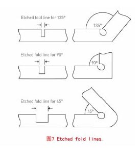 PCM有一些優點,加工和工具修改花費較低,整個過程所需要的時間較短。彎線可以被很精確的蝕刻出來,例如,135,90或者45度,如圖7。整個過程沒有毛邊和金屬應力,磁和其他金屬特性不變。可以很方便的用于復雜的設計,產品有縫,軌道限界孔,徽標和其他細節不會增加最后的費用,這可以使設計者隨意設計他們想要的東西。
