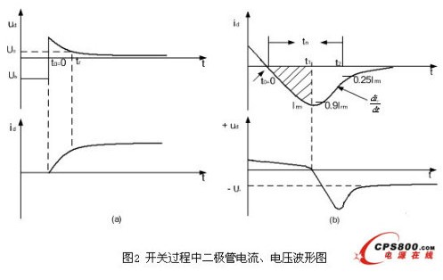 開關管工作在硬開關條件下開關電源自身產生電磁干擾的根本原因,就是在其工作過程中的開關管的高速開關及整流二極管的反向恢復產生高di/dt和高dv/dt,它們產生的浪涌電流和尖峰電壓形成了干擾源。開關管工作在硬開關時還會產生高di/dt和高dv/dt,從而產生大的電磁干擾。圖1繪出了接感性負載時,開關管工作在硬開關條件下的開關管的開關軌跡,圖中虛線為雙極性晶體管的安全工作區,如果不改善開關管的開關條件,其開關軌跡很可能會超出安全工作區,導致開關管的損壞。由于開關管的高速開關,使得開關電源中的高頻變壓器或儲能電感等感性負載在開關管導通的瞬間,迫使變壓器的初級出現很大的浪涌電流,將造成尖峰電壓。開關管在截止期間,高頻變壓器繞組的漏感引起的電流突變,從而產生反電勢E=-Ldi/dt,其值與電流變化率(di/dt)成正比,與漏感量成正比,疊加在關斷電壓上形成關斷電壓尖峰,從而形成電磁干擾。此外,開關管上的反向并聯二極管的反向恢復特性不好,或者電壓尖峰吸收電路的參數選擇不當也會造成電磁干擾。由整流二極管的反向恢復引起的干擾源有兩個,它們分別是輸入整流二極管和輸出整流二極管。它們都是由電流的換向引起的干擾。由圖2表明,t0=0時二極管導通,二極管的電流迅速增大,但是其管壓降不是立即下降,而會出現一個快速的上沖。其原因是在開通過程中,二極管PN結的長基區注入足夠的少數載流子,發生電導調制需要一定的時間tr。該電壓上沖會導致一個寬帶的電磁噪聲。而在關斷時,存在于PN結長基區的大量過剩少數載流子需要一定時間恢復到平衡狀態從而導致很大的反向恢復電流。當t=t1時,PN結開始反向恢復,在t1-t2時間內,其他過剩載流子依靠復合中心復合,回到平衡狀態。這時管壓降又出現一個負尖刺。通常t2《t1,所以該尖峰是一個非常窄的尖脈沖,產生的電磁噪聲比開通時還要強。因此,整流二極管的反向恢復干擾也是開關電源中的一個重要干擾源。