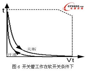 一般來說,可以采用軟開關技術來解決開關管的問題,如圖6所示。圖6給出了開關管工作在軟開關條件下的開關軌跡。軟開關技術主要減小開關管上的開關損耗,也可以抑制開關管上的電磁干擾。在所有的軟開關技術中,準諧振抑制開關管上電磁干擾的效果比較好,所以本文以準諧振技術為例,介紹軟開關技術抑制EMI。所謂準諧振就是開關管在電壓谷底開通,見圖7。開關中寄生電感與電容作為諧振元件的一部分,可完全控制開關導通時電流浪涌與斷開時電壓浪涌的發生。采用這種方式不僅能把開關損耗減到很小,而且能降低噪聲。谷底開關要求關斷時間中儲存在中的能量必須在開關開通時釋放掉。它的平均損耗為,由此公式可以看出,減小會導致大大降低,從而減小開關上的應力,提高效率,減小dv/dt,即減小EMI。