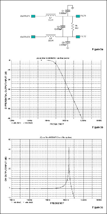 圖3a給出了傳統的PWM型D類輸出LC濾波器,及其理想值。為簡單起見,可假設揚聲器負載具有理想的8電阻,并且忽略電感的直流阻抗。通過一些簡單的SPICE仿真便可得出問題所在。圖3b給出了圖3a中濾波器對差分輸入信號的頻率響應。給出了兩個輸出結點(FILT1,FILT2)相對于GND的響應曲線。圖中給出的器件值在30kHz的頻率以上具有理想的二階滾降,以及理想的瞬態。音頻帶內群延遲特性在4μs內保持平坦。