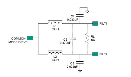 此類D類放大器對輸出濾波器的要求,不同于具有傳統差分輸入和互補PWM輸出的放大器。與PWM相比,MAX9704調制方案的輸出往往含有較高的共模信號,設計輸出濾波器時需要考慮這點。正如后面的實例所示,傳統差分濾波器拓撲結構的效果往往不太理想。