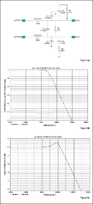 圖5b為圖5a濾波器對差分輸入的響應,圖5c為共模輸入的響應。注意:圖5c中共模截止頻率較高(-3dB帶寬約為110kHz,差分輸入為28kHz),帶有平緩且合理控制的尖峰。該截止頻率遠高于最高音頻(也低于D類開關頻率基波),因此具有較好的效果。