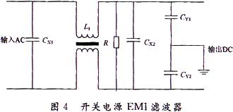 濾波是抑制傳導干擾的一種很好的辦法。在電源輸入端接上濾波器,即可以抑制開關電源產生并向電網反饋的干擾,也可以抑制來自電網的噪聲對電源本身的侵害。開關電源的工作頻率一般在10~130kHz,對開關電源產生的高頻段EMI信號,只要選擇相應的去耦電路或網絡結構較為簡單的EMI濾波器,就能達到理想的濾波效果。干擾抑制電路如圖4所示,CX1和CX2叫做差模電容,L1叫做共模電感,CY1和CY2叫做共模電容。電阻R用于消除可能在濾波器中出現的靜電積累。IEC-380安全技術條件標準的8.8部分指出,若CX>0.1μF則R=t/2.2C(t=1s,C=2CXμF)。