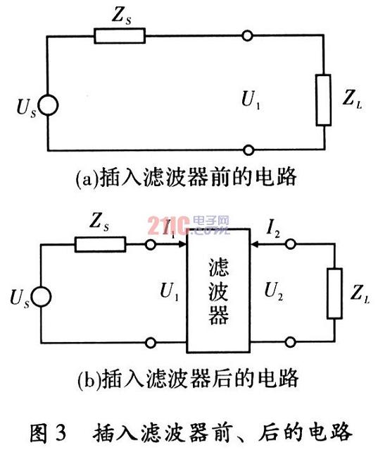 插入損耗是評價濾波器性能的主要指標,它是頻率的函數。插入損耗的定義為,沒有濾波器接入時,從噪聲源傳輸到負載的功率P1和接入濾波器后噪聲源傳輸到負載的功率P2之比,用dB表示。插入損耗越大,說明濾波器抑制干擾的能力越強。濾波器接入前后的電路圖,如圖3(a)和圖3(b)所示。濾波器的插入損耗由式(1)表示。