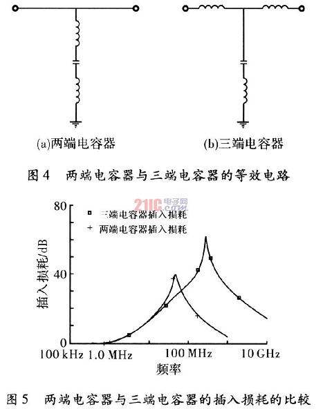 在高頻線路中,因為一般電容器的引線具有電感分量,所以影響了其高頻特性。而三端電容器在結構上可以做到與電容器串聯的剩余電感分量很小,因此其插入損耗特性優于兩端電容器,從而改善了電容器的高頻特性。三端電容器有引線式和片狀式兩種。