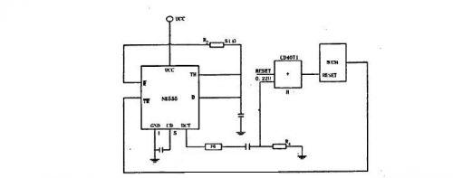 采用單穩態觸發器NE555作為微機看門狗電路;當系統工作正常時,看門狗電路不起作用,當系統運行不正常時,80C51的P1.1引腳不能給定時器送去觸發脈沖,這時NE555中單穩態觸發器就輸出脈寬大于4US負脈沖,經F6反相后加至80C51的復位端,使系統可靠的復位,這樣可防止因外界干擾引起的程序跑飛,使微機程序正常運行,見圖1。