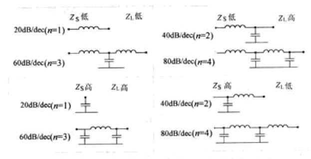 EMC設計中的濾波器通常指由L,C構成的低通濾波器。濾波器結構的選擇是由"最大不匹配原則"決定的。即在任何濾波器中,電容兩端存在高阻抗,電感兩端存在低阻抗。圖1是利用最大不匹配原則得到的濾波器的結構與ZS和ZL的配合關系,每種情形給出了2種結構及相應的衰減斜率(n表示濾波器中電容元件和電感元件的總數)。