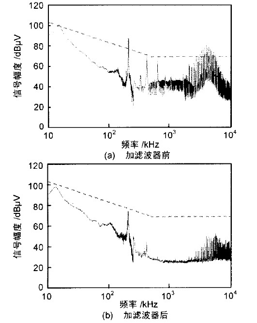 減小電容耦合和互感耦合測試曲線如圖3 所示。因為電容耦合和互感耦合的存在,經常出現圖3(a)這樣的測試結果。這是因為電源線濾波器的輸入輸出線捆成一束,濾波器輸出線上的雜波電流直接通過電容和互感耦合到輸入線上,使濾波器形同虛設。解決這一問題只需將濾波器的輸入輸出線分別截短并盡可能遠離,保持一定角度,并將線固定在機箱殼體上,這樣就使得輸入線輸出線上的干擾電流不能直接耦合,電源線經過濾波器后干擾電流得到抑制。