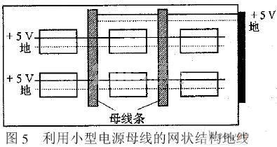 對于同類單元電路(或元器件)提高電磁兼容性效果的有效方法是采用網狀結構地線如圖4所示。圖中實線為正面軌線,虛線為反面軌線,實線與虛線相互垂直,交叉點處由金屬化孔連接。這樣電流可以就近回流。圖4中的垂直地線可能給正面布線造成一定困難,可用小型母線來替代,并與電源供電線連結起來如圖5所示。圖中垂直的寬線條代表小型電流母線,可以裝卸,便于調度。