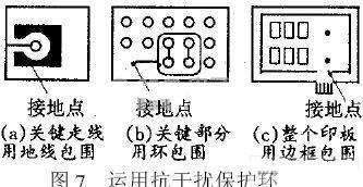 4.2在敏感元器件接線端頭和印制板的邊框用地、環保護起來,如圖7所示。注意保護環不能充當電流回線,只能單點接地。