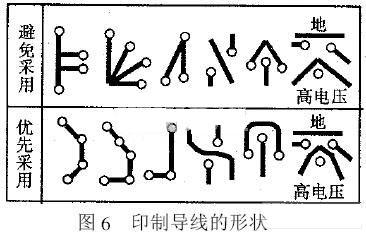 4.1 走線形狀不要有纏結和分支或硬拐角。因為那樣可能會破壞導線特性阻抗的一致性或導致反射和產生諧波或局部高電壓引起放電現象。一般優先選用和避免采用的印制導線形狀,如圖6所示。