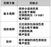 表1列舉了3種主要的下變頻技術,同時指出了各自優缺點。基本混頻似乎是最佳方案。在4.6GHz~6GHz下變頻場合,使用固定頻率的本振,1.1GHz輸出信號的頻帶與輸入信號頻帶相同,因此稱為區變頻。